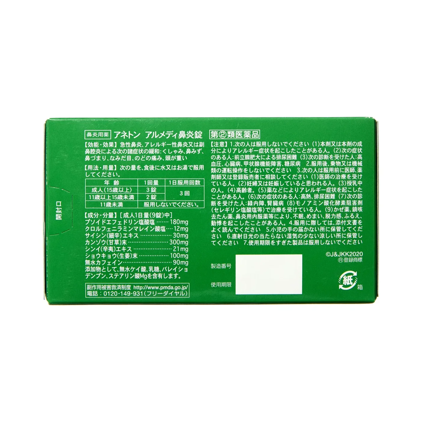 急性鼻炎、アレルギー性鼻炎又は副鼻腔炎による次の諸症状の緩和:くしゃみ、鼻みず、鼻づまり、なみだ目、のどの痛み、頭が重い