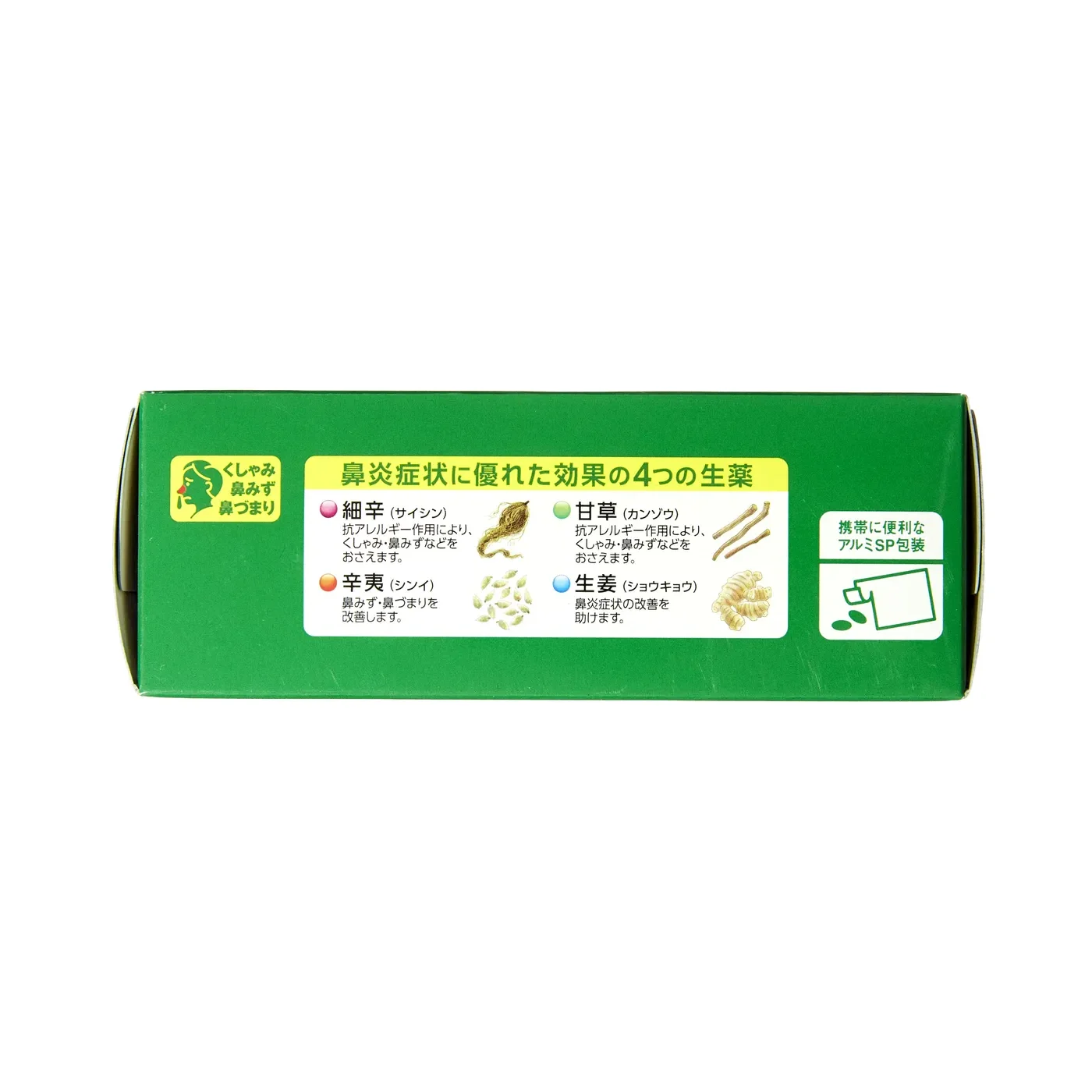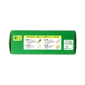 鼻づまりに効くプソイドエフェドリン塩酸塩と、抗アレルギー作用のあるサイシンエキス、カンゾウ末などの生薬を配合しています。