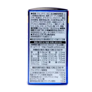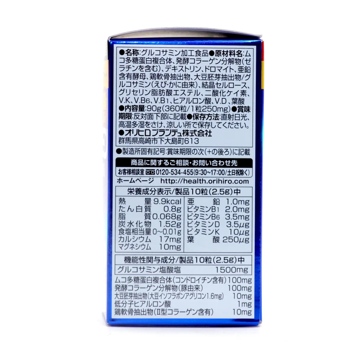 発酵コラーゲン分解物(ゼラチンを含む)(国内製造)、ムコ多糖蛋白複合体(豚肉を含む)、デキストリン、ドロマイト、亜鉛含有酵母、鶏軟骨抽出物、ビタミンK含有食用油脂粉末、大豆胚芽抽出物/グルコサミン(えび・かに由来)、結晶セルロース、グリセリン脂肪酸エステル、二酸化ケイ素、V.B6、V.B1、ヒアルロン酸、葉酸、V.D
